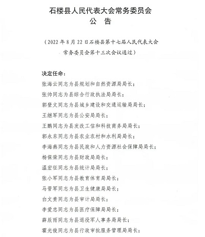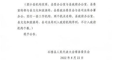 另据石楼县人民代表大会常务委员会公告,因小县机构改革,县委办公室与县政府办公室、县委宣传部与县文化和旅游局、县委政法委员会与县司法局合署办公,实行一套工作机构、两个机关名称。县政府办、文化和旅游局、县司法局列入政府机构序列,不计入政府个数。