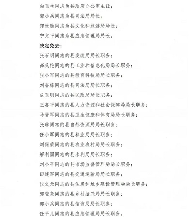 改革后,设置党政机构22个,均为正科级建制,其中党委序列6个,政府序列16个,在8月22日县人大常委会对政府组成部门负责人进行任命后,按照人口小县改革实施方案工作要求以及县委安排,8月25日至26日,各涉改单位陆续挂牌县领导分别为各单位揭牌。