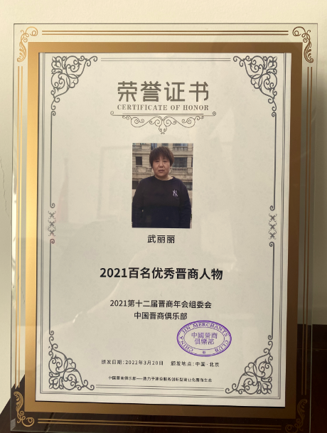2022年9月7日,受2021第十二届晋商年会组委会、中国晋商俱乐部秘书处委托,淄博市晋商商会向2021百名优秀晋商人物、淄博乐鸿阀门管件有限公司总经理武丽丽颁发了荣誉奖牌。