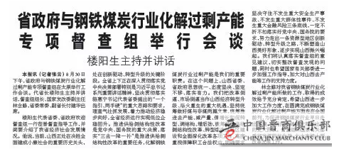 8月30日下午,省政府与钢铁煤炭行业化解过剩产能专项督查组在太原举行工作会谈。代省长楼阳生主持并讲话,督查组组长、国家发改委副主任林念修,省委常委、副省长付建华出席。