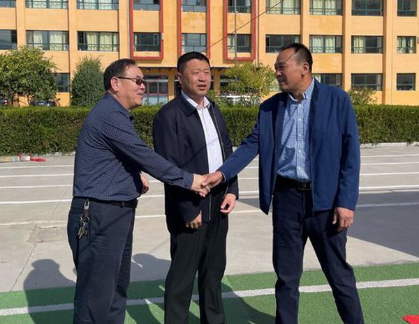 五寨县教育科技局局长周晋堂(左)与谢副会长握手交流,表示感谢