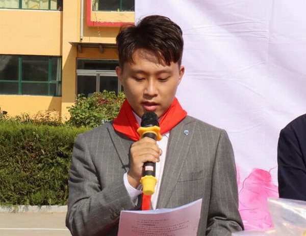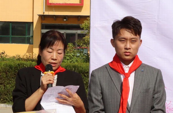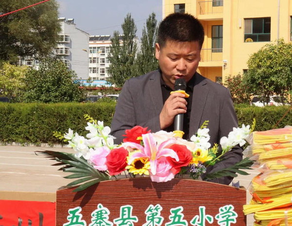 活动开始,主持人向五寨县第五小学师生介绍出席本次活动的领导嘉宾,并由学生们为领导嘉宾佩戴红领巾。