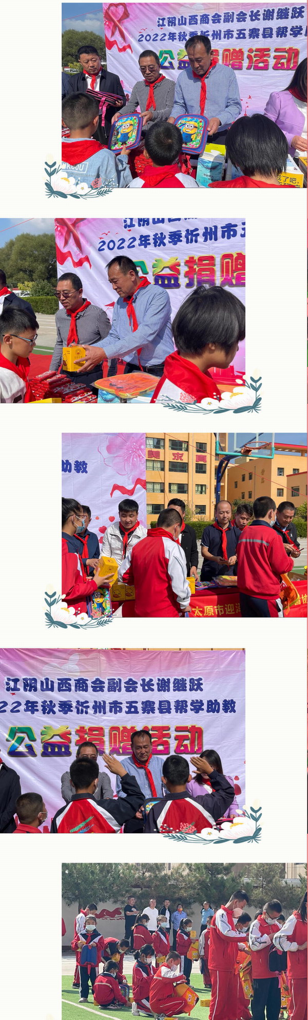 江阴山西商会谢继跃副会长自从参加了忻州市郑连生市长召开的“迎老乡,回故乡,建家乡”恳谈会后,为能尽自己的绵薄之力,连续几年先后在太原市小店区,吕梁市岚县,忻州市忻府区、岢岚、原平、偏关、豆罗等上述市、县、区个人出资60余万元,对二十几所幼儿园,小学,残障学校的贫困学生进行了爱心捐赠活动,今天又在五寨县第五小学为五寨县的七所小学的特困生进行帮学助教,捐资助学公益捐赠活动。