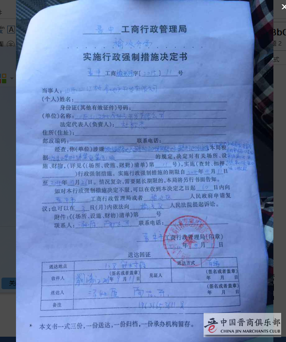 孰料,9月15日,山西晋中报料人致信中国晋商俱乐部秘书处“何谓民营经济发展空间巨大,我们企业的合法经营就在9月1日之后收到了晋中市工商局的粗暴对待”。