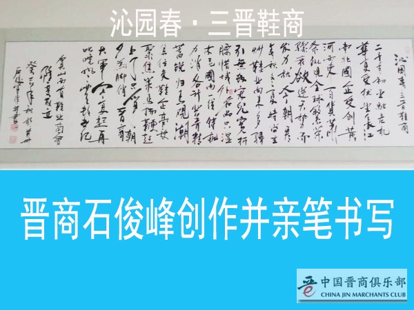 交流结束前,石俊峰会长向刘文斌秘书长分朗诵了2013年山西鞋业商会成立时他创作并且亲笔书写的“沁园春·三晋鞋商”,从石俊峰会长的朗诵中,刘文斌秘书长表示“很受感动,何为优秀晋商?如石俊峰这样心怀感恩,心怀产业,激情拼搏的老总,优秀晋商实至名归”。