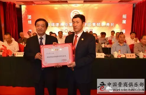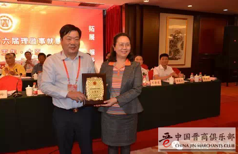 福建省委统战部副部长、省工商联党组书记王玲向太原贺林贸易公司董事长黄建俤颁发监事长牌匾