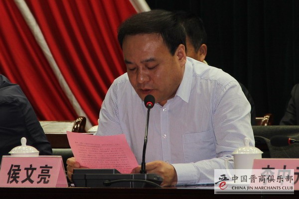 中共祁县县委副书记侯文亮向山西省民营经济促进会成立大会至欢迎词,侯文亮代表祁县县领导四大班子、全县的民营企业和祁县27万父老乡亲对省民营经济促进会的成立表示热烈的祝贺。
