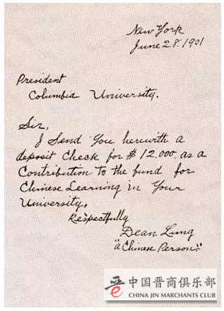 “五十多年以来,我是从喝威士忌和抽烟草的账单里一点一点地省出钱来。这笔钱随此信奉上。我以诚悦之心情将之献予您去筹建一个中国语言、文学、宗教和法律的系;并愿您以丁龙汉学讲座教授为之命名。这个捐赠是无条件的,唯一的条件是不必提及我的名字。但是我还想保持今后再追加赠款的权利……”