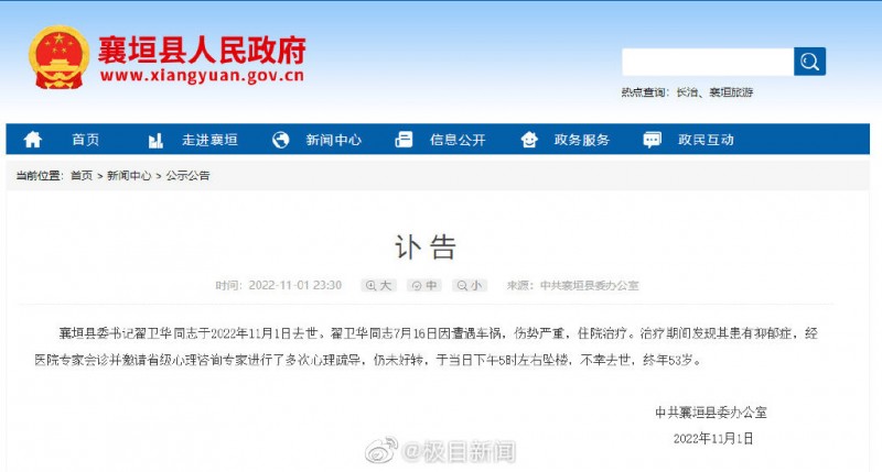 【#山西襄垣县委书记翟卫华坠楼去世#,车祸救治期间发现患有抑郁症】11月1日晚,中共襄垣县委办公室发布讣告:襄垣县委书记翟卫华同志于2022年11月1日去世。翟卫华同志7月16日因遭遇车祸,伤势严重,住院治疗。治疗期间发现其患有抑郁症,经医院专家会诊并邀请省级心理咨询专家进行了多次心理疏导,仍未好转,于当日下午5时左右坠楼,不幸去世,终年53岁。