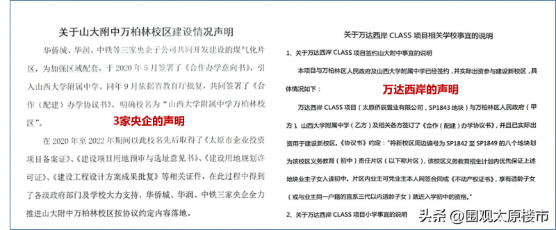 被单独撇下的万达也在随后发了声明,对小学和中学做了保证,还是原来那套说辞:小学是公立的,就近划片入学,我项目可以就近入读山西省实验小学万柏林第二校区,山大附中万柏林校区也已经签约并且实际出资参与建设,也能上。
