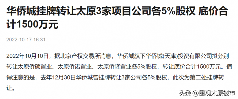 也不光是侨辰,其他项目公司华Q城也一直在退,最近的一次股权转让还是在上个月,一次性挂了三个项目公司各5%的股权。