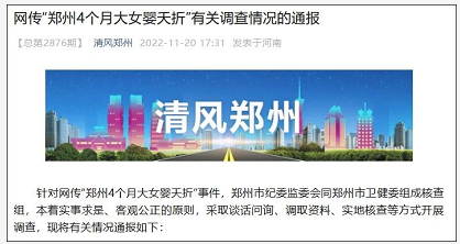 据微信公众号“清风郑州”11月20日消息,针对网传“郑州4个月大女婴夭折”事件,郑州市纪委监委会同郑州市卫健委组成核查组,本着实事求是、客观公正的原则,采取谈话问询、调取资料、实地核查等方式开展调查,现将有关情况通报如下: