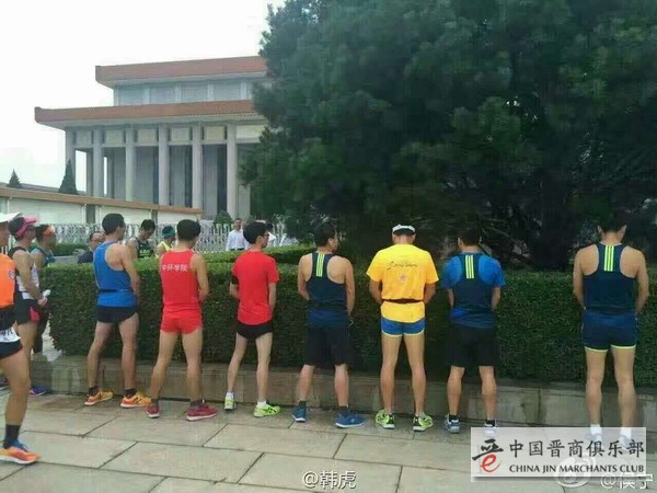 9月16日,北京马拉松。在毛主席纪念堂围墙外,一群马拉松选手选择了集体撒尿,其中还有某“中环学院”的字样。