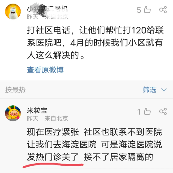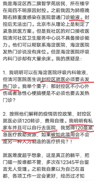 这位西二旗居民本身并不需要紧急救助,但是按社区的回复必须走紧急救助渠道。现在办点事情离了社区不行。他需要的仅仅是像平时那样照常去普通门诊输液,但是因所在楼封控,只要就医整体都得到发热门诊。联系了发热门诊,说没有床位,而他本来可以去的呼吸内科还有大量床位,但是对不起,不能使用。