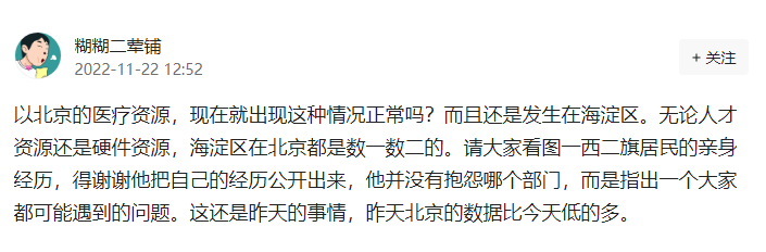 以北京的医疗资源,现在就出现这种情况正常吗?而且还是发生在海淀区。无论人才资源还是硬件资源,海淀区在北京都是数一数二的。请大家看图一西二旗居民的亲身经历,得谢谢他把自己的经历公开出来,他并没有抱怨哪个部门,而是指出一个大家都可能遇到的问题。这还是昨天的事情,昨天北京的数据比今天低的多。