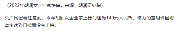 央广网记者注意到,今年胡润女企业家上榜门槛为140元人民币,格力的董明珠因财富未达到门槛而没有上榜。