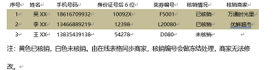 每日将中奖信息使用在线金山文档同步给相关类目商家,消费者到店领取时,需报出姓名、手机号码、身份证后六位进行核销。