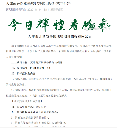 早在2200年11月,鹏飞集团招标平台公众号便发布了天津南开区战备楼地块项目招标意向公告,提前锁定鹏飞集团在天津拿地。据知情人透露,鹏飞集团是山西建投推荐来的。
