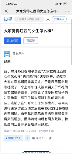 1月12日晚,澎湃新闻(www.thepaper.cn)注意到,疑似发布“1888万彩礼”文章的知乎“匿名用户”,在知乎原话题“大家觉得江西的女生怎么样”下面发表致歉声明。