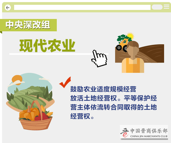 针对这种情况,中央深改组提出要形成农村土地所有权、承包权、经营权三权分置、经营权流转的格局。此后,深改组还明确提出要放活土地经营权,在依法保护集体所有权和农户承包权的前提下,平等保护经营主体依流转合同取得的土地经营权,保障其有稳定的经营预期。一前一后两次出台文件,既为现代农业从业者消除了土地流转的障碍,同时也为其稳定经营吃下了一颗定心丸。