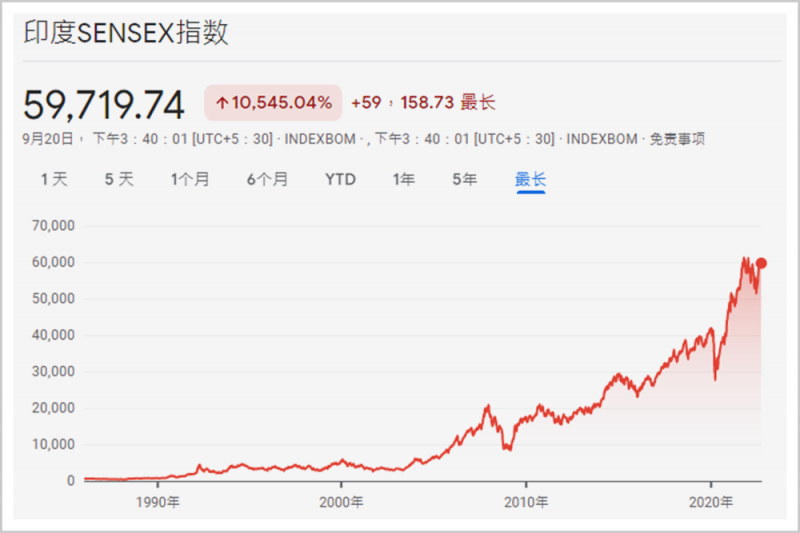 过去20年,印度股市从不到3000点,飙升至近6万点,上涨20倍。
