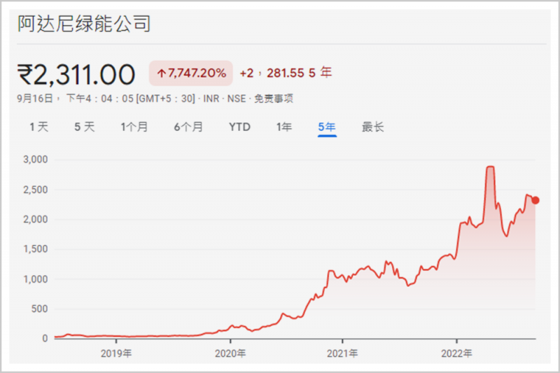 受两大因素影响,阿达尼集团旗下上市公司的股价飙升,两年平均上涨了十几倍,阿达尼绿能公司,更是在过去五年上涨了足足77倍!