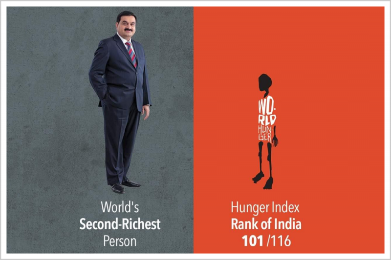 不少人对阿达尼的“敛财术”心有怨言,有人为此还绘制了一幅图,讽刺这位全球第二富豪背后,是一个饥饿指数全球排名垫底的印度。