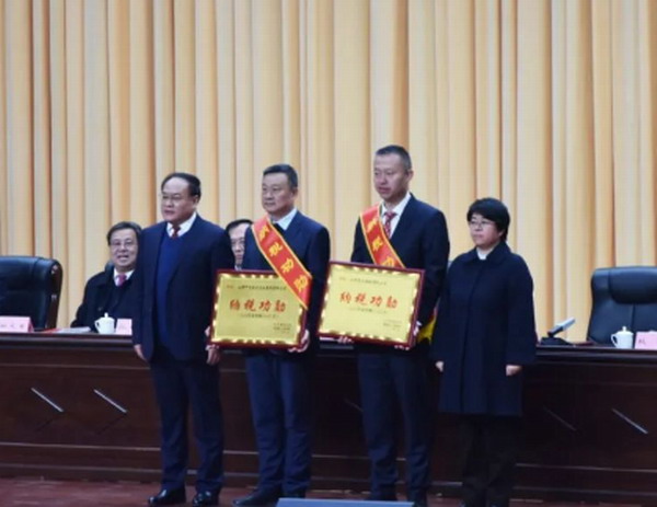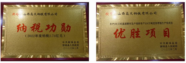 山西高义钢铁有限公司荣获“2022年度纳税功勋”和“2022年度重点项目建设优胜项目”两大奖项,公司副董事长冯继征和党支部书记陈伟代表公司先后上台领奖。