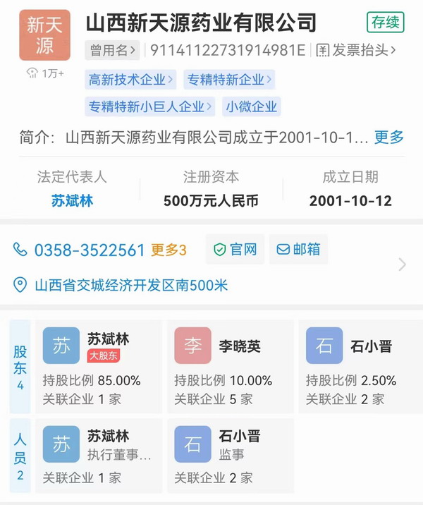 新天源药业控股股东及法定代表人为苏斌林,曾为上海市山西商会会长曹立华旗下庞泉科技控股股东及法定代表人。