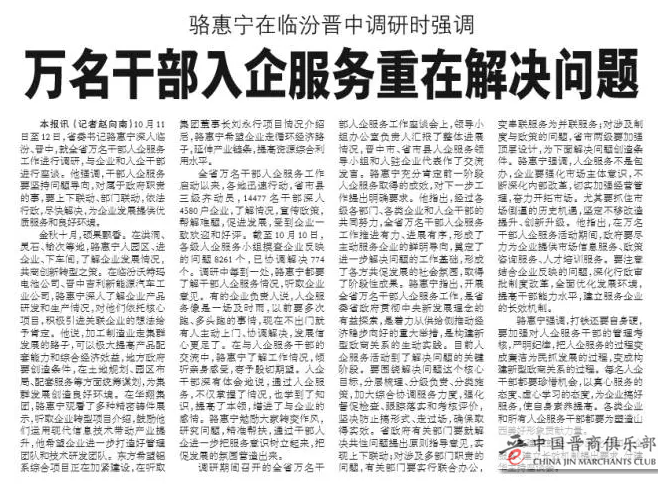 10月11日至12日,省委书记骆惠宁深入临汾、晋中,就全省万名干部入企服务工作进行调研,与企业和入企干部进行座谈。他强调,干部入企服务要坚持问题导向,对属于政府职责的事,要上下联动、部门联动,依法行政,尽快解决,为企业发展提供优质服务和良好环境。