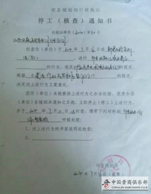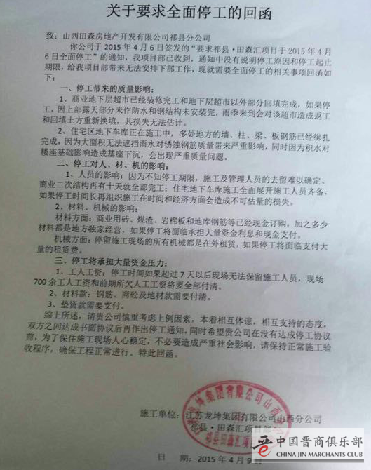 王新广坦言祁县田森汇项目停工,是因祁县政府单方面提高补偿标准,否定合同优惠条件,导致征拆成本高达400多万元/亩。且住宅、商业主体工程早已全部封顶,却未办理任何相关开发手续,期间祁县县委政府主要领导催促项目进度,但相关主管部门因无手续陆续下达了《停工通知书【祁规法停字(2014)】第30号》、《停止违规预售商品房通知书【祁建停售字(2014)】2002号》、《行政处罚告知笔录(消防)》文件等,项目也多次遭到拆迁户及村民的“恶意阻挠”等群体事件,影响开发持续进行。为避免企业遭受更大损失,规避违法施工及经济风险,不得已于2015年4月被迫全面停工。