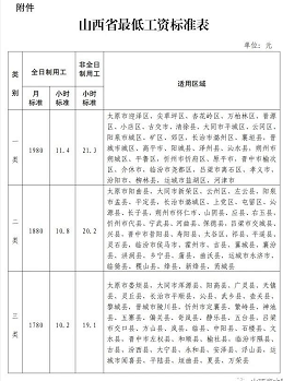 《通知》显示,山西省政府决定将全省全日制用工月最低工资标准调整为一类1980元、二类1880元、三类1780元。同时,相应将全省全日制用工小时最低工资标准依次为一类11.4元、二类10.8元、三类10.2元;非全日制用工小时最低工资标准依次为一类21.3元、二类20.2元、三类19.1元。