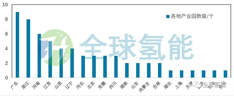 2017-2022年各地氢能产业园数量分布,图源全球氢能,统计可能存在疏漏,仅供参考