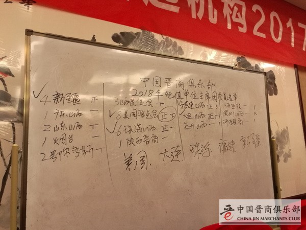 后经中国晋商俱乐部秘书处再次确认,大连市山西商会会后反馈表示考虑到商会2018年中将进行换届,咱不考虑进入轮值单位主席团,所以最终由“美国晋商总会、珠海市山西商会、福建省山西商会、新疆山西商会、山西省民营经济促进会”共同组成中国晋商俱乐部联合发起机构2018年轮值单位主席团。